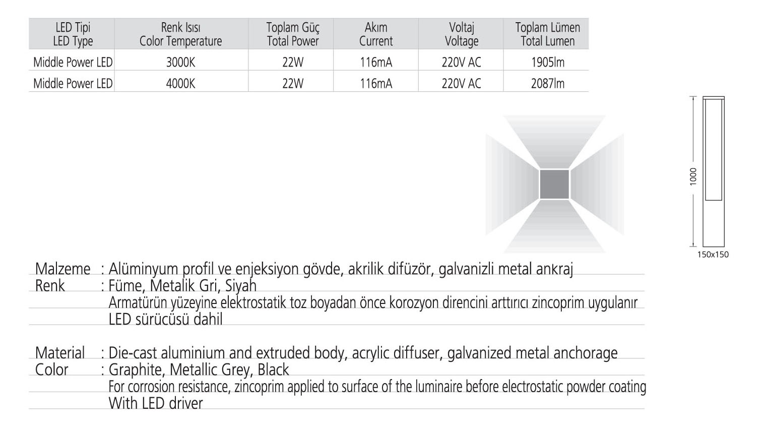 Armatürün yüzeyine elektrostatik toz boyadan önce korozyon direncini arttırıcı zincoprim uygulanır. LED sürücüsü dâhil