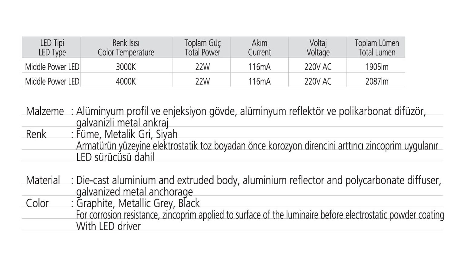• Toplam Lümen 1905lm-2087lm