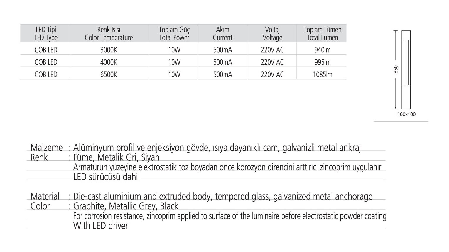 • Ölçüler 100x100x850