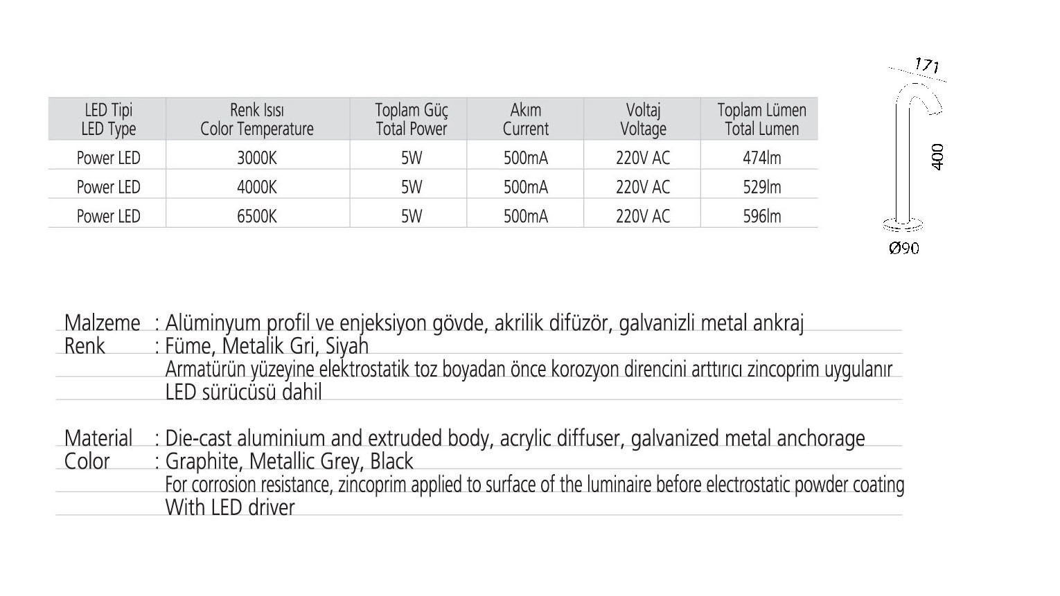 • Toplam Lümen 474lm-529lm-596lm