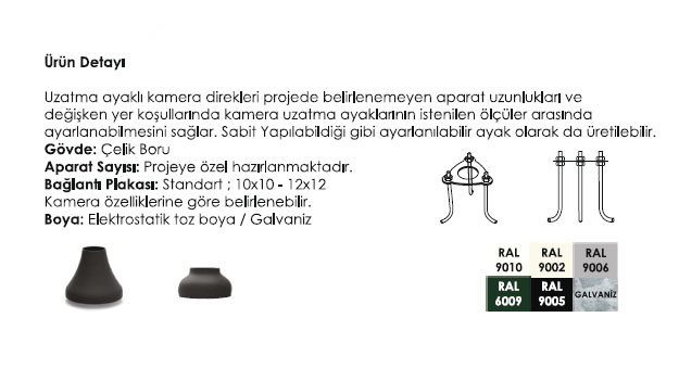 Uzatma ayaklı kamera direkleri projede belirlenemeyen aparat uzunlukları ve değişken yer koşullarında kamera uzatma ayaklarının istenilen ölçüler arasında ayarlanabilmesini sağlar. Sabit Yapılabildiği gibi ayarlanılabilir ayak olarak da üretilebilir.